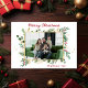 Este simples cartão de fotos botânico verde-aquarela e bagas com sua foto favorita no centro e as palavras "Feliz Natal" em uma fonte moderna em vermelho sobre a foto e seu nome de família e o ano em vermelho na mesma fonte do roteiro é perfeito para enviar aos seus amigos e familiares. É um design mínimo e clássico que certamente trará sorrisos aos rostos de cada receptor. A parte de trás é um preto correspondente.