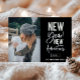 Novas Aventuras de Ano Novo, cartão com fotos de Férias. Apresenta uma tipografia branca-quic moderna a preto, com a coordenação de padrões geométricos a preto e dourado.