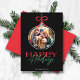 Essas placas de cartões de natal de 5 pol x 7 pol, brancas, possuem um ornamento de árvore fotográfica com um arco vermelho. A saudação é, "Feliz Feriados", em vermelho, verde sobre um fundo preto com espaços reservados para sua foto favorita, nome(s) da família e ano.