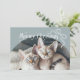 Cartão de modelo de foto de gato de Natal bonito com um texto engraçado que diz "Feliz Natal". Adicione suas fotos de gato neste cartão de quadro de arco azul de pedra. Há uma ilustração de um arco.