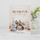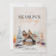 Esta design de cartão está cheia de cor e a alegre terra maravilhosa do inverno com árvores cobertas de neve e uma mansão de casas de colheita. Pássaros do Red Robin Inverno. Escrito legante e saudações da serifpografia Season. Tipografia personalizada.