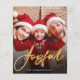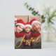 Este é um na moda de orçamento e um cartão de feriado moderno impresso em uma folha de papel plana, usando um simples design baseado em fotos com "Joyful" em um elegante roteiro manuscrito em ouro. Altere facilmente a foto na frente e mude o nome da família ou da empresa usando as opções de modelo fornecidas. Entre em contato com o designer para fazer perguntas ou problemas relacionados a este design ou a produtos correspondentes.