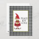 O cartão natalício apresenta adorável gnomo da estila escandinava com o texto "Peace, Joy, Love" sobre fundo de xadrez de búfalos preto e branco. Personalize de volta com sua própria mensagem especial para os feriados.
