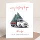 Um cartão de Natal festivo de 5x7 dobrado com o cabeçalho alegre “Feliz Natal para você” em tipografia moderna manuscrita vermelha, combinado com um gráfico vintage de um caminhão de entrega de árvore de Natal. Desenhado em um fundo branco limpo, este cartão de cumprimentos retrô elegante combina charme nostálgico com um layout minimalista moderno. Personalize a seção “com amor de” e abaixo com o nome da sua família em tipografia complementar para um toque caloroso e personalizado. Perfeito para compartilhar amor e votos de Natal, este design divertido e clássico não fotográfico adiciona personalidade à temporada enquanto espalha alegria festiva. Um design de Natal atemporal ideal para famílias, indivíduos e casais.