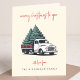 Um cartão de Natal festivo 5x7 dobrado com o cabeçalho alegre “Feliz Natal para você” em tipografia moderna manuscrita vermelha, combinado com um gráfico vintage de um caminhão de entrega de árvore de Natal. Criado em um fundo creme vintage, este cartão de Natal elegante e retrô combina charme nostálgico com um layout minimalista moderno. Personalize a seção “com amor de” e abaixo com o nome da sua família em tipografia complementar para um toque caloroso e personalizado. Perfeito para compartilhar amor e desejos de Natal, este design divertido e clássico não fotográfico adiciona personalidade à temporada enquanto espalha alegria festiva. Um design de Natal atemporal ideal para famílias, indivíduos e casais.