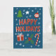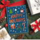 Mande alegria nesta temporada com um cartão de Natal brilhante com rabiscos feitos à mão de névoas, árvores, borbulhas, estrelas e flocos de neve. Uma maneira divertida, mas sincera, de se conectar com os entes queridos e compartilhar alegria festiva que se sente pessoal e singular. Colocado sobre um fundo azul.