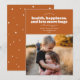 Este cartão de férias moderno contém as palavras "desejando-lhe saúde, felicidade e muito mais abraços no próximo ano" escrito em branco sobre um fundo cor de ferrugem. Tem espaço para uma fotografia de solteiro e seria perfeito como um cartão de férias ou um cartão de ano novo.