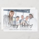 Cartão plano de feriados felizes para o logotipo comercial de orçamento. Um cartão plano de 5,5 x 8,5" para as suas saudações festivas em um estoque de cartão SEMI GLOSS 110 lb brilhante (semelhante à espessura de um cartão postal). OBSERVE: O envelope fornecido com este cartão é maior que o cartão a 6,75" x 9". Basta substituir a foto de amostra por uma foto festiva de seus funcionários para a frente, que está atrás de uma camada de opacidade de gradiente para que o texto se destaque bem. Você muda as cores do texto se for melhor se adequar à sua foto através da opção personalizar mais. No verso, substitua a imagem de amostra pelo seu logotipo. Felizes Feriados estão em uma escrita informal e personalizam facilmente o resto da tipografia de ambos os lados ou removem qualquer coisa que não seja necessária.