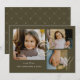 Apresentamos nosso cartão de Natal de foto colagem Elegant Modern Joy – uma maneira moderna e sofisticada de capturar o espírito natalino com um toque de sofisticação. Este cartão apresenta um fundo verde profundo que define um tom rico e elegante e tem tipografia única em folha de ouro falso impressionante, tornando-o uma escolha elegante para enviar votos calorosos. A palavra "JOY" é exibida de forma elegante em tipografia moderna e única em folha de ouro falso, adicionando um toque de glamour e festividade ao design. Nota: o efeito de folha de ouro é simulado na arte e nenhuma folha de ouro real é adicionada durante a impressão. 3 de suas fotos são exibidas em um layout de colagem moderno, resultando em um cartão de Natal impressionante e elegante que transmite seus votos mais calorosos. A parte de trás do cartão de Natal apresenta um design elegante coordenado, e você pode adicionar texto e fotos adicionais usando o botão Editar usando a ferramenta de design ao personalizar o cartão. Celebre a temporada de Natal com estilo e sofisticação enviando nosso cartão de Natal de foto colagem Elegant Modern Joy. Seja para compartilhar a alegria e o amor da sua família, comemorar momentos especiais ou simplesmente enviar votos calorosos de Natal, este cartão é a escolha perfeita para tornar sua temporada de Natal verdadeiramente elegante e moderna. Peça o seu hoje e deixe a alegria das festas brilhar intensamente!