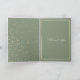 Feliz Natal com uma estrela dourada confetti e uma moldura dourada para fotografia. Personalize a foto e personalize os detalhes para adicionar o nome da família. Adicione suas mensagens ou sessões de saudação às costas. Um fundo verde sábio com a tipografia cursiva moderna de Branca de Neve.