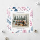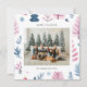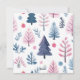 Cartão de férias com ilustrações de árvores de Natal fofas em uma paleta de cores pastéis com uma foto da família emparelhada com uma saudação de férias e seu nome e ano em uma fonte sem serifa.