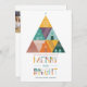 Este cartão de férias da empresa não fotográfica apresenta uma árvore de Natal geométrica festiva e brilhante com casas triangulares. A frente tem uma mensagem perfeita para as empresas imobiliárias e diz "NÃO HÁ LUGAR COMO CASA PARA OS FERIADOS. QUE SUA ESTAÇÃO DE FÉRIAS SEJA FELIZ E BRILHANTE", com um tipo colorido divertido. A parte traseira apresenta uma foto da empresa, um logotipo e espaço para uma mensagem adicional.