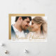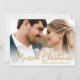 Este belo cartão com fotos com sua foto favorita de casamento e as palavras "Natal casado!" em um roteiro de ouro moderno e seu nome e o ano em uma fonte clássica limpa trará um sorriso para o rosto de cada destinatário. Todos vão gostar de ouvir suas grandes notícias e de tirar uma foto de casamento de você.