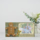O fundo desta placa de saudação fotográfica tem uma fotografia de um homem de pão-de-gengibre numa prateleira de arrefecimento numa toalha de mesa verde. Texto personalizável para o seu nome. Carregue sua própria foto e este cartão está pronto para ir! Comprar em massa e salvação!