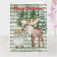 No inverno físico / Natal, o cartão Holiday apresenta alce de aquarela e cabra de cabelo comprido com árvores cobertas de neve em fundo de folha de música manchada de água doce verde. Texto "Feliz Natal" vermelho personalizável