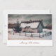 Um Cartão de Saudação Feliz de Natal com uma imagem vintage de uma paisagem de neve com uma cabana, seu telhado e cerca de madeira, um alfinete e alguns pacotes de presentes. O céu está espumante com estrelas. Será perfeito enviar seus desejos, seja para sua família ou amigos. Você também pode usá-lo para sua empresa!