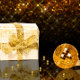 Ilustração glamourosa, moderna e profissional de Natal com uma caixa branca de presentes com desejos de Natal de ouro, uma bola de Natal de ouro e pérolas de ouro num brilhante fundo de ouro.