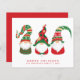 Cartão de férias simples, acessível ao orçamento, que inclui três gnomos escandinavos bonitos com chapéus e tunicados vermelhos e verdes sazonais. Você pode personalizar um "Feliz Natal", "Feliz Natal", etc., saudando seu nome e o ano na coordenação da tipografia vermelha.