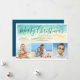 Mande saudações de estação quente com este cartão de Natal de praia. Os cartões com fotos costeiros apresentam uma onda de aquarela verde-marinha em uma costa arenosa. Letras no topo da onda dizem "Feliz Natal" em uma bonito cor azul-verde-oceano. Três fotos são colocadas abaixo da onda pintada. Para personalizar, adicione seus nomes e três fotos favoritas.