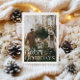FELIZES HOLIDAYS | Cartão de Férias Fotográficas. Tipografia moderna minimalista em bege suave com cor verde-escura de respaldo.