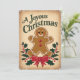 Este "Cartão de Férias de Natal Alegre" é um design festivo e entusiasmante que captura a essência do feriado. O cartão apresenta um biscoito alegre de gengibre com um rosto amigável, olhos vermelhos e bochechas rosadas, colocados contra um pano de fundo bege aconchegante. Folhas verdes e ocas com bagas vermelhas moldam o homem do pão-de-gengibre, enquanto um grande arco vermelho adiciona um toque de elegância. Ideal para enviar cartões de natal a familiares, amigos ou colegas. Esta carta é uma forma divertida e na moda para celebrar a magia do Natal e espalhar alegria a todos à vossa volta.