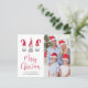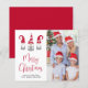 Cartão de férias mínimo e econômico com a sua fotografia e três gnomos nórdicos bonitos com chapéus e tunicados de cinzas nórdicas, de cor vermelha e branca, ao estilo escandinavo. "Feliz Natal" está escrito em um roteiro vermelho de tendências. Adicione o seu nome a uma simples tipografia moderna.