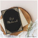 Cartão de Férias Eid Mubarak. Cartão de cor preta elegante com uma decoração vintage na moldura. Um design luxuoso para enviar aos familiares e amigos muçulmanos por ocasião do Eid al-Fitr islâmico. Personalize todas as informações que estão escritas. Envelope em branco incluído.
