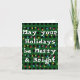 O cartão festivo de férias moderno apresenta fundo preto e verde, com filas brancas de luzes de férias brilhantes.