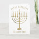 Mande um cartão personalizado aos seus entes queridos nesta época de Chanucá. Este design apresenta uma menorah dourada. Acima disso, a mensagem diz "Happy Hanukkah". Abaixo da menorah está um lugar para seu nome familiar que você pode personalizar ou remover se quiser. Na dentro do cartão lê-se "Desejando-lhe paz, amor e alegria nesta estação de Chanucá", que pode ser mantida como está ou personalizada de acordo com o seu gosto. Também, há um lugar para sua assinatura. Projetado pelo artista © Tim Coffey.