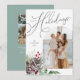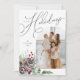 Este cartão com fotos de modelo de feriado apresenta a foto da sua família enquadrada em uma forma de arco de tendência. O cartaz elegante diz Feliz Feriados. Apresenta botânicos de inverno desenhados à mão, incluindo bagas, pinheiros, pinos e folhas. Há uma foto atrás com uma mensagem pessoal de sua escolha.