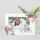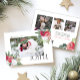 Um Cartões de foto de Natal colorido e moderno com uma grande foto com flores vermelhas e brancas nos cantos externos. A palavra Joyful em uma fonte moderna se sobrepõe ligeiramente a uma grande foto centrada. A parte de trás do cartão contém mais três fotos com uma mensagem sincera para o feriado e o ano novo.