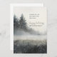 Uma simples e mínima aquarela serena apresentando uma queda de neve na floresta, um nevoeiro suave, e pinheiros verdes, com um verso simples sobre a paz.