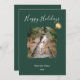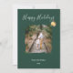 Este é um design moderno e elegante de cartão de Natal com um fundo verde floresta profundo. A parte superior do cartão exibe a saudação "Feliz Natal" em uma fonte caligráfica branca fluida. Uma moldura distintiva com pinceladas artísticas no centro segura uma foto personalizada (mostrada aqui como um casal em trilhos de trem), dando à imagem uma borda pintada e texturizada. Um ornamento dourado em estilo aquarela pintado à mão pende do final do texto da fonte, adicionando um acento metálico festivo. A parte inferior do cartão apresenta um texto branco limpo e sem serifa que diz "DA NOSSAA FAMÍLIA" seguido por um ano placeholder "202x".