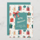 Coloque alguns pacotes de presentes no seu cartão de Natal! Parece engraçado, mas dê uma olhada. Nós achamos que os pequenos pacotes e caixas são divertidos e o padrão é muito bonito. Estas designs são de adorável origem de vintage. As aquarelas dos pacotes estão em matizes, mas alegres, matizes sazonais que mostram o feriado de inverno: vermelhos, verdes, amarelos, azuis e cremes em um fundo leve. Eles parecem um pouco retrógrados, especialmente por causa do arco cor-de-rosa e da proeminência do chalé. Todo o texto desta placa plana, que está em uma cor de creme correspondente, pode ser alterado. Certifique-se de editar os nomes de família e a data.