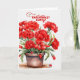 Um pote encantador de cravos vermelhos com dois joelhos e corações vermelhos cria um doce cartão para o casal celebrando juntos suas ruas.
