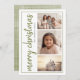 Um design minimalista que inclui 3 fotos com uma caligrafia moderna rústica e um grande cartões de natal. O verso inclui um padrão lamacento de cor d'água.