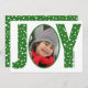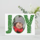 Joy e Neve verde, o mínimo cartão de Natal de Natal. Ele apresenta a palavra "JOY" em verde, com padrão de flocos de neve brancos. A letra "O" contém uma foto. O verso contém um padrão de bolinhas branco em verde e outra foto da família.O verde pode ser alterado para qualquer cor.
