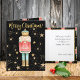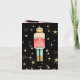 Um cartão de Natal Nutcracker que apresenta um quebra-cabeça pintado a aquarela com estrelas de ouro cintilantes contra um céu noturno, com Feliz Natal escrito em um guião de ouro ao longo do topo.