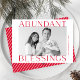 Cartão com fotos de férias colorido e moderno, com a expressão "Bênçãos Abundantes" em letras vermelhas. Personalize o cartão adicionando sua foto, nome e ano. A placa se reverte para exibir um padrão listrado vermelho e branco.
