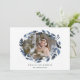 Os cartões de natal botânicos elegantes apresentam uma foto favorita, horizontal ou orientada à paisagem, rodeada por uma coroa oval de luxuosa folhagem azul e flores brancas. Personalize com sua saudação e nomes personalizados abaixo; mostrados com "Paz na Terra".