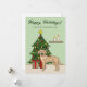 A ilustração original do desenho animado de Destei de um cão da raça Labrador Retriever, de cor amarela, casaco. O cachorro está parado por uma árvore festiva de Natal decorada com ornamentos vermelhos e amarelos, uma pérola branca e uma estrela amarela que é colocada no topo da árvore. Há também dois presentes envoltos pela árvore e atrás do cachorro há uma prateleira marrom com duas velas. A cor do chão é bege e a cor de fundo é verde-claro. Há também duas áreas de texto personalizáveis.