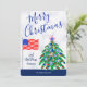 Cartões de Natal patrióticos com uma árvore de Natal vermelha, branca e azul, uma bandeira americana e seu texto personalizado. Totalmente personalizável, o design é colocado sobre um fundo da mármore das cinzas, Feliz Natal em uma fonte azul brilhante e ousada é corajosamente impressa no topo, esses cartões patrióticos de saudação plana são fáceis de personalizar. Todas as modelos de texto, frente e verso, podem ser editadas para que você possa adicionar uma saudação especial à parte traseira das placas, se desejar. A América deus abençoe na frente pode ser mudada para "e Feliz ano novo" e FELIZ e o NATAL pode ser editado para "Feliz" e "Feriados" de acordo com suas necessidades. Desde os ornamentos vermelhos, brancos e azuis na árvore verde simples até a bandeira dos EUA voando orgulhosamente ao lado dela, esses cartões de Natal patrióticos em formato de cartão plano espalharão orgulho americano e alegria de Natal para seus amigos e família longe e longe.