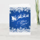Flocos de neve brancos, Papai Noel com seu trenó e rena em um fundo de vitrine azul. Texto em frente ao cartão em russo - Feliz ano novoю. Dentro em russo também: Que Ano Novo entre em sua casa com boa sorte e felicidade e que todos os seus sonhos venham a verdade.