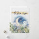 Deseje à sua família e amigos Eid Mubarak este ano com este lindo cartão de férias. Com bela arte aquarela, uma lua crescente crescente e folhagem verde com eucalipto e outras folhagens florais. Acentuações de brilho dourado tornam este cartão especial. Tipografia de escrita elegante. Escrita árabe em cor azul-marinho.