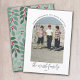 Uma grande foto de Natal com uma borda branca faz um cartões de natal moderno e ousado. A assinatura da família é um enorme roteiro moderno. Utilize uma imagem vertical com o assunto preferencialmente no meio ou na direção do topo. Faça uma saudação de Feliz Natal única e moderna com uma tendência e um padrão alegre nas costas. Design de trás A design de trás inclui um padrão botânico de Natal em vermelhos tortuosos e verdes.