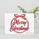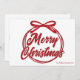 Chic, moderna escrita cursiva através de uma bela fita vermelha e arco lê MERRY CHRISTMAS em elegante tipografia cursiva. Um arco amarrado é uma super tendência para 2025 cartões postais não fotográficos de feriado. Personalize com seu nome de família ou de empresa no canto inferior direito.