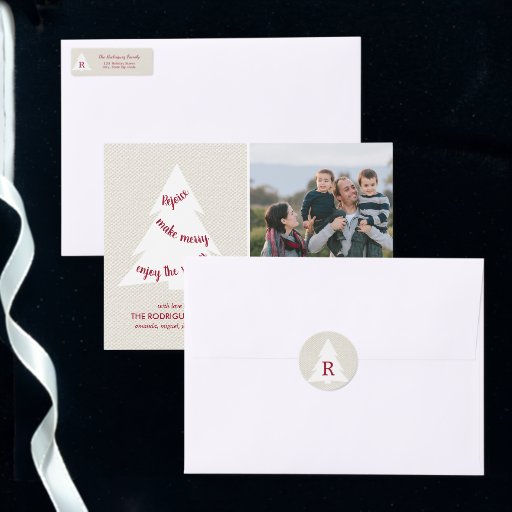Crie seu próprio cartão de feriado elegante moderno, adicionando sua foto, seu nome de família e seus nomes na barra lateral. O lado esquerdo da placa apresenta uma árvore geométrica branca em um plano de fundo bege com textura de canvas falsa impressa. As palavras "Alegre", "faça feliz" e "aproveite a estação" da terra da árvore de Natal em tipografia curvada de burgundy. Seu texto personalizado aparecerá abaixo da árvore no tipo vermelho profundo. Você também pode adicionar o ano, se quiser. O dorso apresenta um padrão geométrico de árvores brancas de tamanhos variáveis num fundo bege neutro correspondente. Para ver as árvores brancas design no padrão de Natal bege em outros itens, clique no link de coleção "Artes Rocklawn" abaixo. Imagem criada digitalmente. Placa design, copyright ©Claire E. Skinner. Todos os direitos reservados. Fotografia © Storytree Studios, Stanford, CA