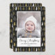 Enviar cartões de natal personalizáveis e personalizados a amigos, colegas e familiares em cartões com fotos simples, minimalistas, elegantes, divertidos, festivos e modernos! Uma bela variedade de ouro e árvores brancas de pinheiro da Floresta de Natal em fundo preto rodeia sua foto em papel redondo. A saudação "Feliz Natal" está escrita em caligrafia elegante, e abaixo apresenta sua mensagem de saudação personalizada do nome da sua família na tipografia moderna. Inverso para revelar um belo histórico do padrão de árvores de pinheiro da Floresta de Natal de cheio.