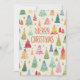 Um cartão festivo não fotográfico apresenta ilustrações originais em aquarela de árvores de Natal coloridas.