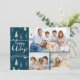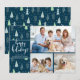 Cartão de cartões de natal moderno com 3 fotos, uma tipografia de escrita de caligrafia saudando FÉRIAS FELIZES e um padrão de fundo de abstrato azul e verde Natal e árvores florestais na neve do inverno. Entre em contato com o designer por meio do Zazzle Chat ou makeitaboutyoustore@gmail.com se você quiser que este design seja modificado, em outro produto ou quiser coordenar itens.